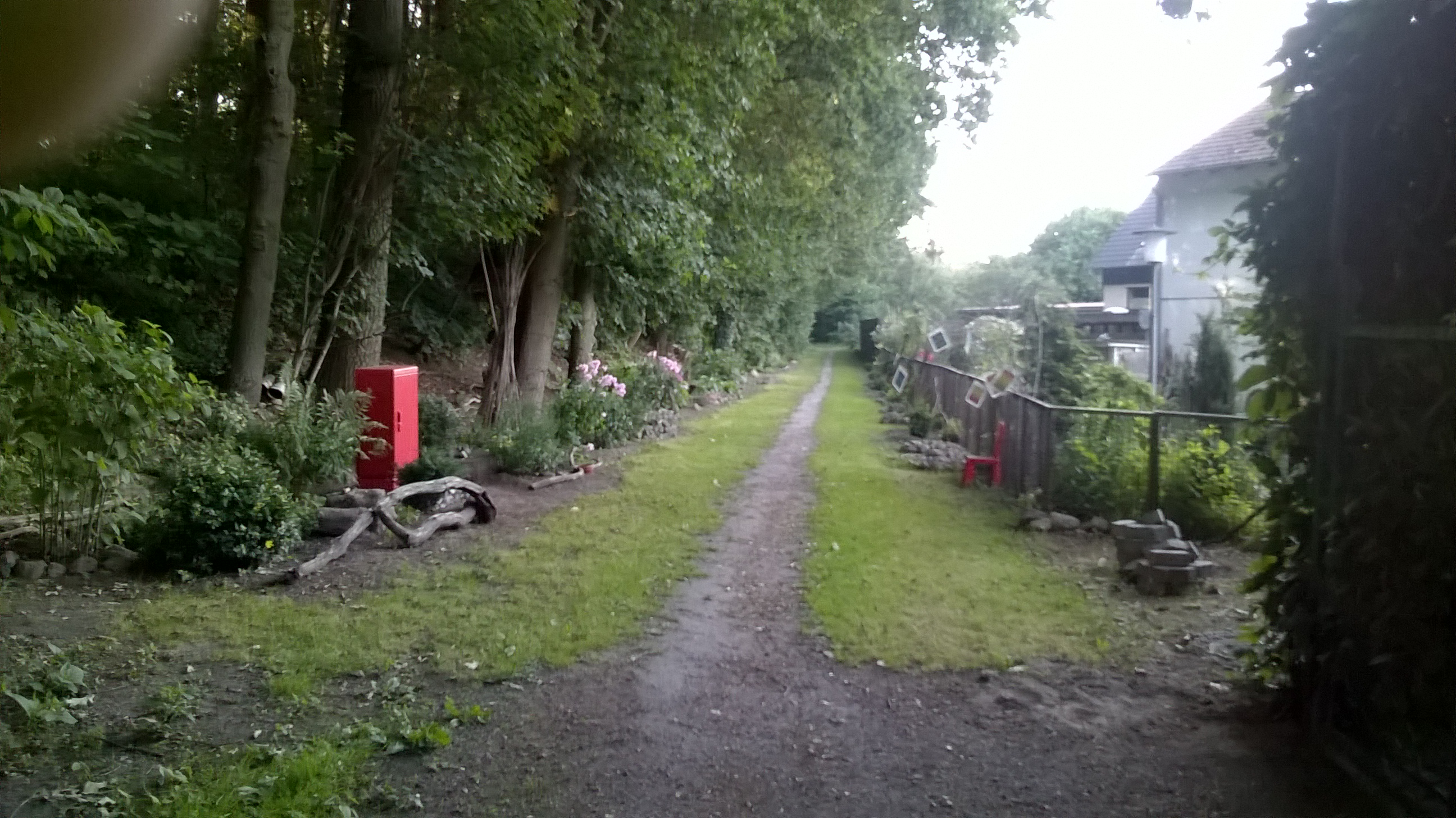 Wir gehen unten am Niedersand an der Kippe entlang nach Norden, auf der Helenriede (oder besser dem verrohrten Graben der Helenriede). Und dort treffen wir auf die Kunst-Meile von Wedesbüttel, ein kunstvolles Arrangement von Natur und Artefakten auf diesem Pfad an der Kippe.